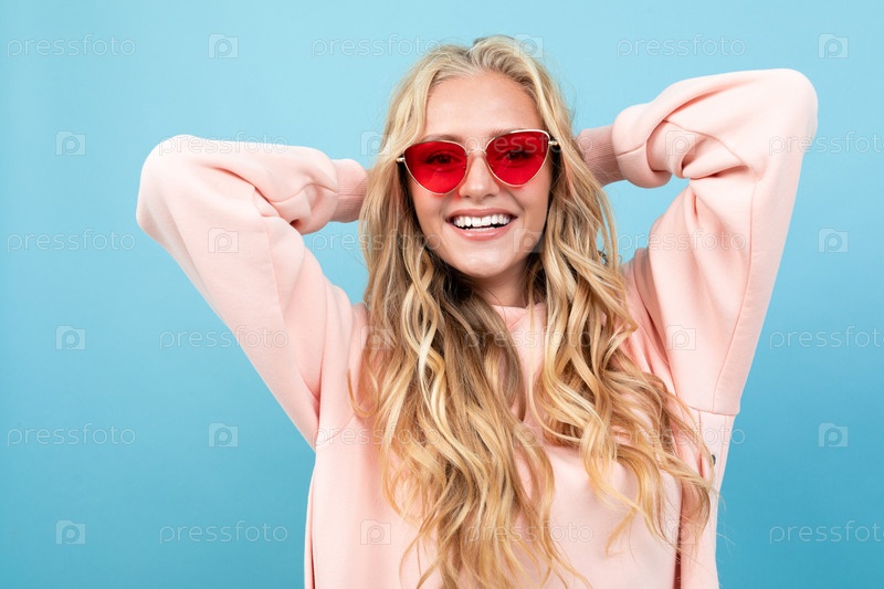 Крупным планом портрет привлекательной очаровательной стильной блондинки в гламурных ретро солнцезащитных очках на синем фоне