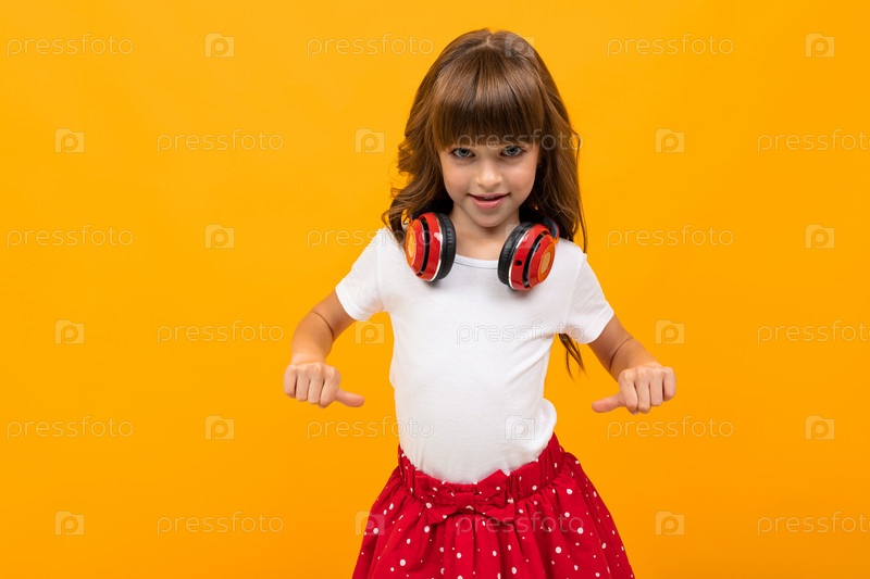 Милая девушка с красными наушниками на желтой стене