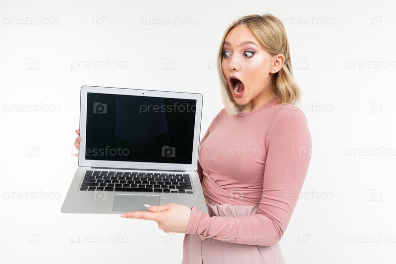 Удивленная блондинка в розовой одежде держит ноутбук с дисплеем вперед с пустой заготовкой на фоне белой студии
