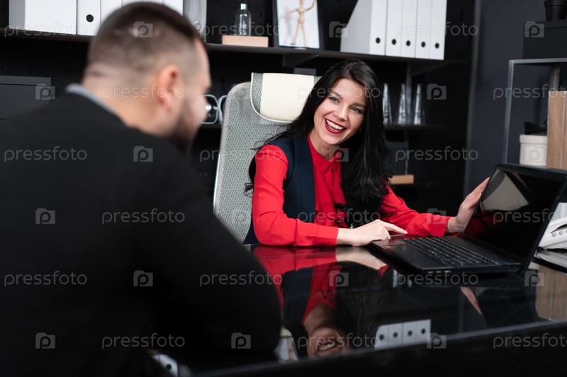 Деловые люди смотрят на пустой экран ноутбука на встрече в стильном офисе