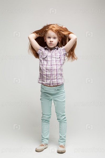 Милая рыжая маленькая девочка в клетчатой рубашке, ярко-синих брюках и белых ботинках