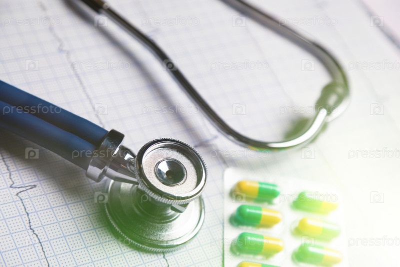 Кардиограмма, пачка таблеток и синий медицинский стетоскоп. Медицинские приборы на столе у врача. концепция медицины и здравоохранения. головка стетоскопа лежит на кардиограмме на блокноте буфера обмена