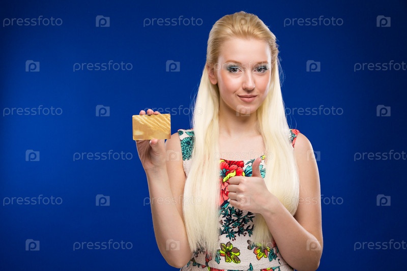 Молодая девушка с кредитной картой в руках на синем фоне