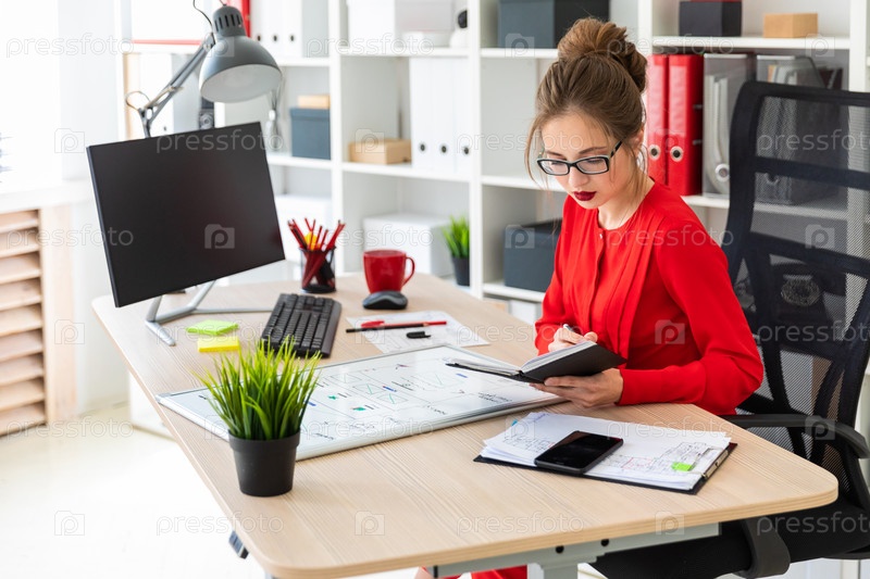 Молодая девушка сидит за столом в офисе, держит в руке маркер и работает с блокнотом и магнитной доской