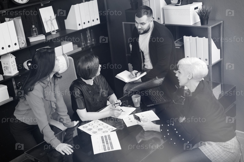 Улыбающиеся сотрудники говорят на рабочем месте. черно-белый