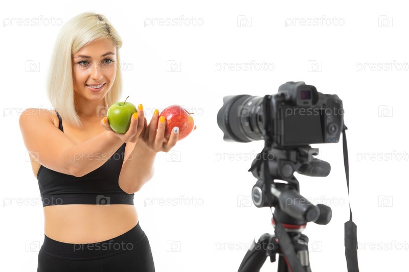 Спортивная девушка в спортивной форме показывает яблоки на камеру на белом фоне