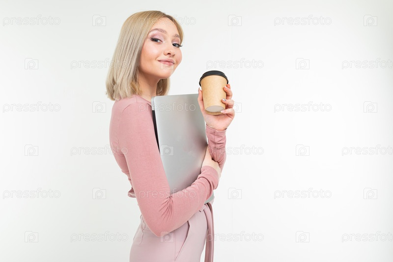 Девушка на кофе-брейке с чашкой кофе и ноутбуком в руках на белом фоне