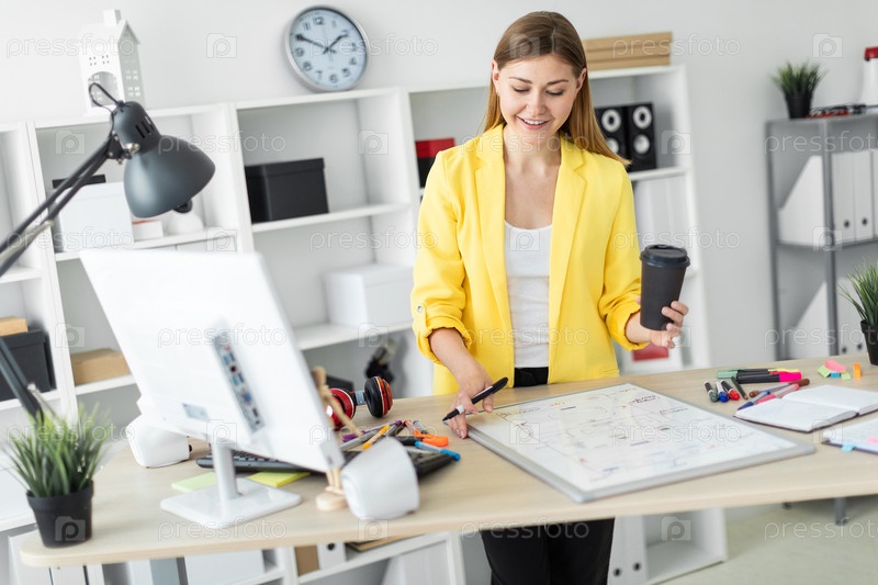 Красивая молодая девушка в белой футболке и желтой куртке работает в ярком офисе. фото с глубиной резкости