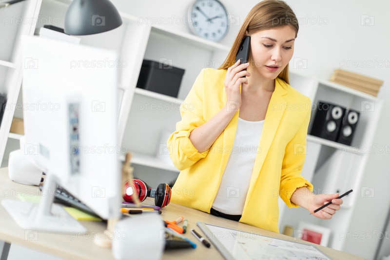Молодая девушка стоит возле стола, разговаривает по телефону и держит в руке карандаш. Перед девушкой на столе магнитная доска