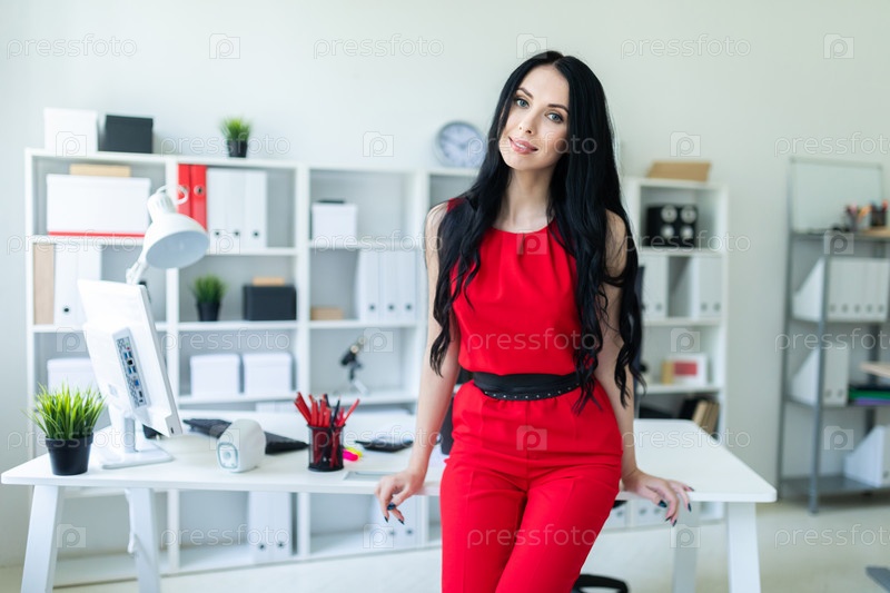 Портрет молодой девушки в красном деловом костюме