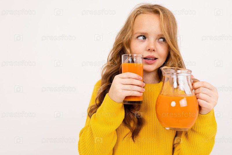 Счастливая девочка-подросток с рыжими волосами, капюшоном и желтыми брюками эмоционально пьет морковный сок на белом фоне