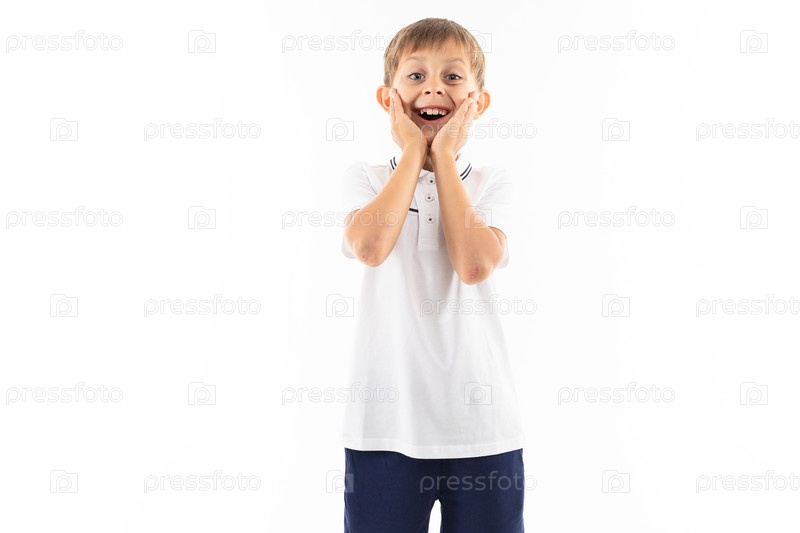Смеющийся мальчик с челкой в белой футболке на белом фоне с копией пространства