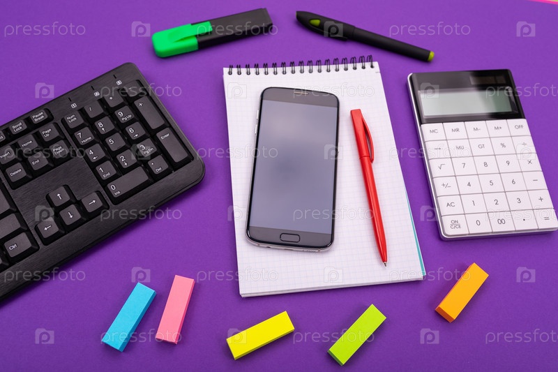 Плоская планировка бизнес-стола со смартфоном, клавиатурой, калькулятором и ручкой на красочном фиолетовом фоне