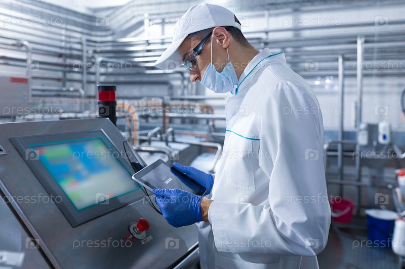 Технолог настраивает производственную линию, стоя возле цифрового экрана в цехе молочного завода