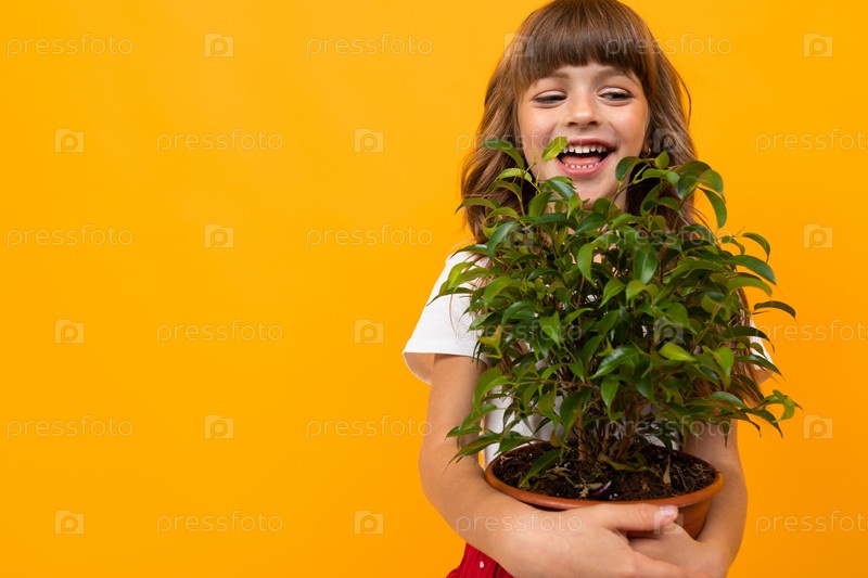 Девушки держат в руках самодельный цветок в горшке на оранжевом фоне крупным планом с копией пространства