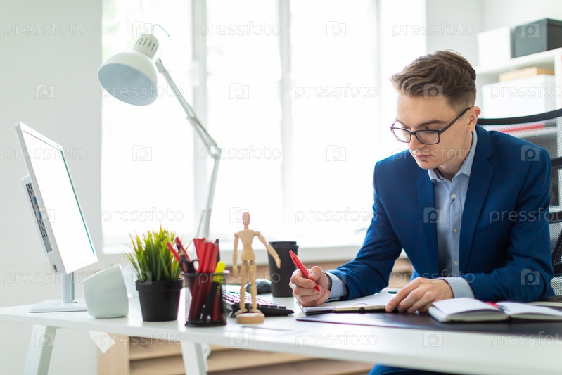 В офисе работает красивый молодой человек в очках, синем костюме и светлой рубашке. фото с глубиной резкости