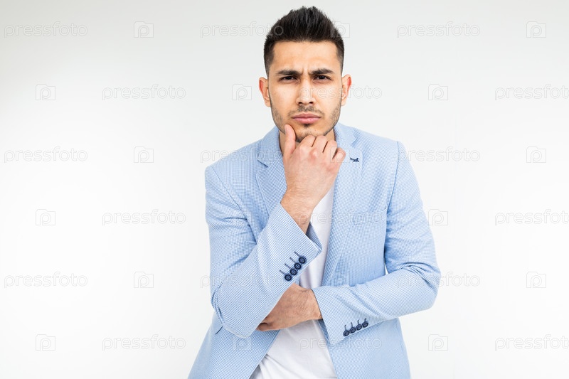 Очаровательный мужчина в синем классическом пиджаке думает о решении и проблеме на белом фоне с копией пространства