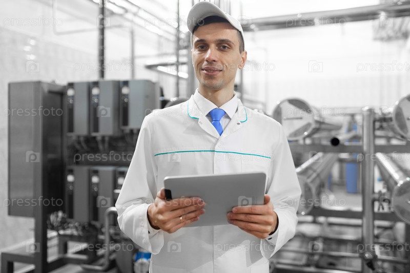Портрет мужчины в белом халате и кепке, стоящего в производственном цехе молочной фабрики с серой табличкой