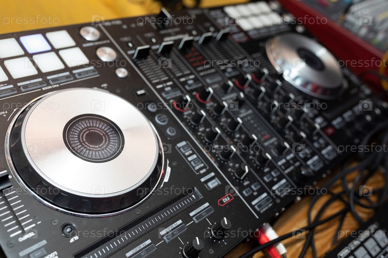 Диджейская музыкальная консоль, ноутбуки и наушники ярких цветов света в ночном клубе на ярком красно-синем фоне