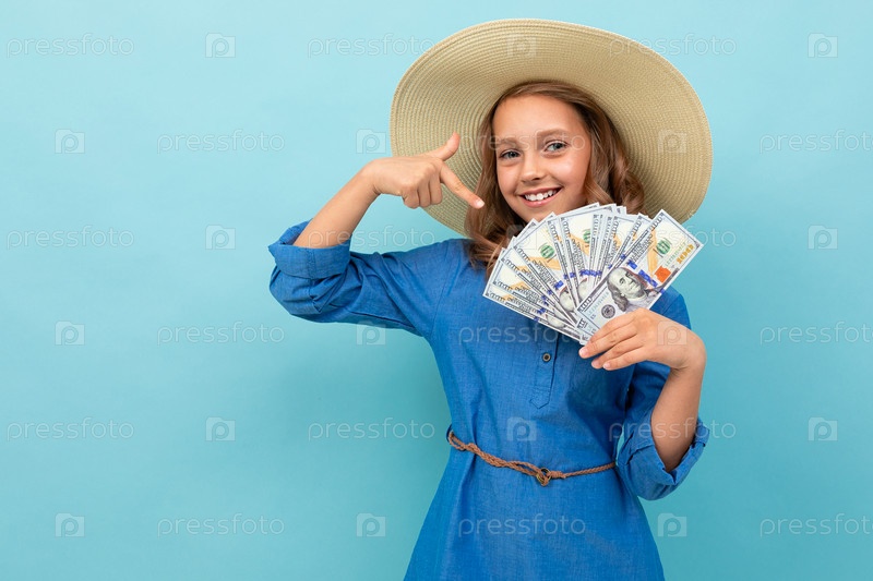 Девушка с волнистыми каштановыми волосами в голубом платье, большая шляпа показывает деньги и радуется на синем фоне