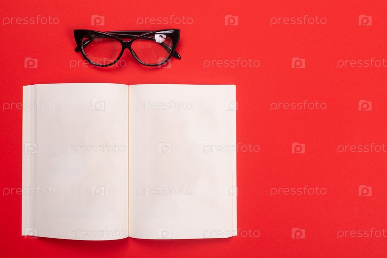 Блокнот и очки, изолированные с копирайтом на красном фоне