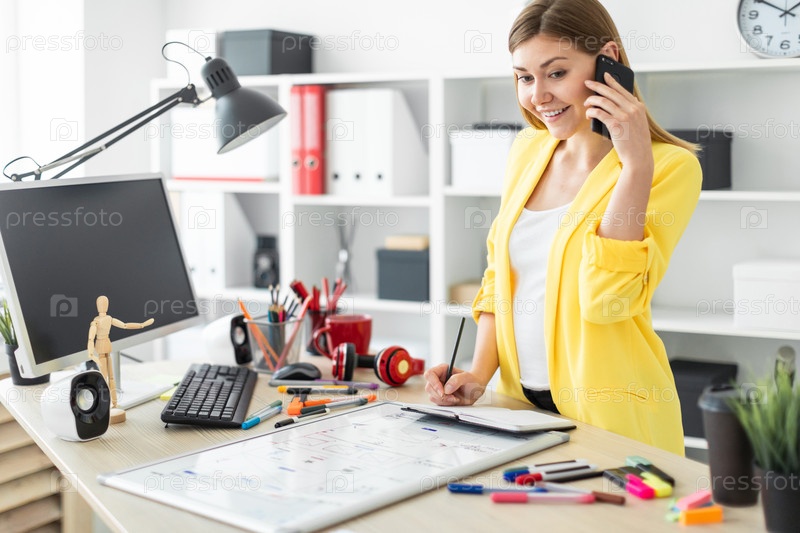 Молодая девушка стоит возле стола, разговаривает по телефону, держит в руке карандаш и делает записи в блокноте. Перед девушкой на столе магнитная доска