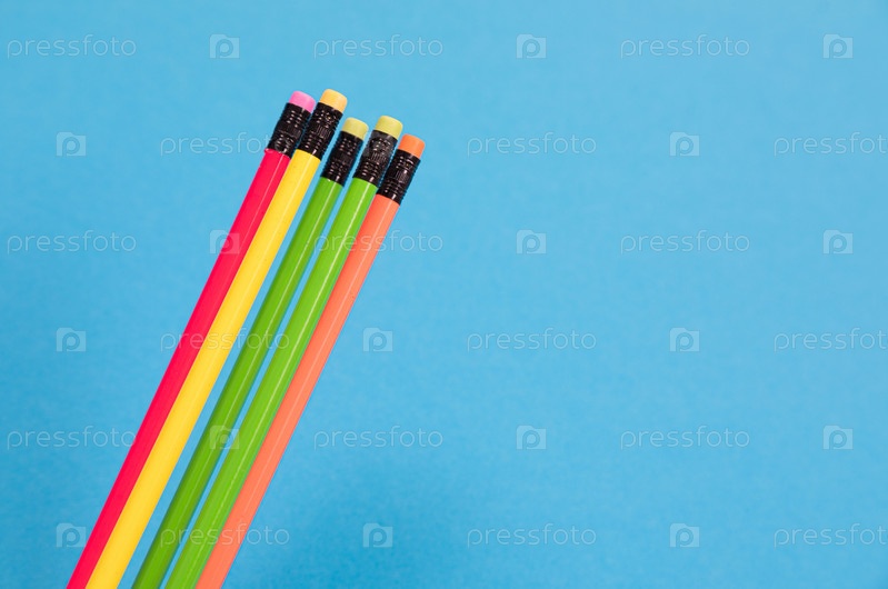 Пять разноцветных мелков с резинками лежат на лазурном фоне