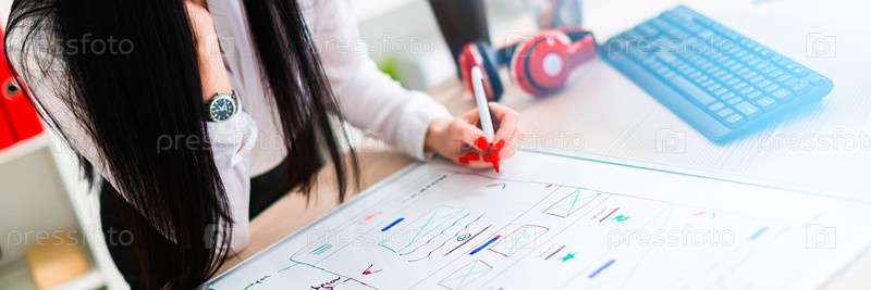 Возле стола стоит молодая девушка в очках, держит в руке маркер и рисует на магнитной доске