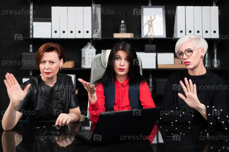 Предприниматели, работающие за компьютерным столом. Три бизнесвумен работают с ноутбуком в современном офисе. Встреча для обсуждения совместных вопросов