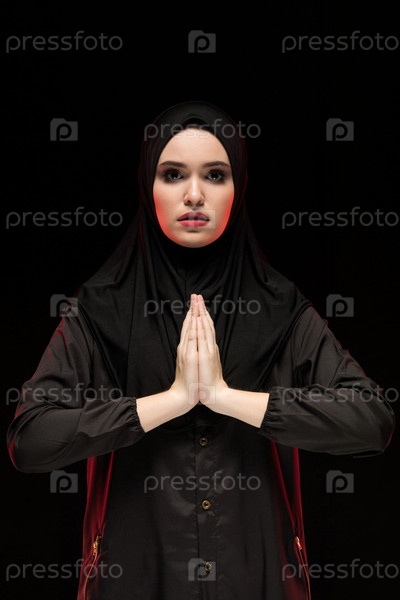 Привлекательная уверенная в себе серьезная арабская женщина-мусульманка, одетая в черный хиджаб, стоящая в студии и смотрящая в сторону с руками возле лица, как концепция религиозной веры