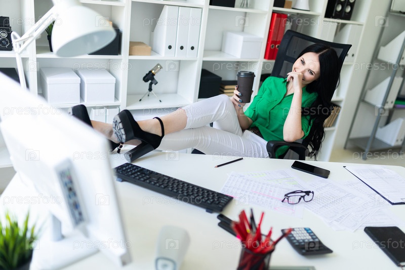 Красивая девушка в зеленой блузке и белых брюках сидит за офисным столом. фото с глубиной резкости