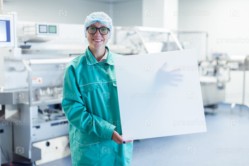Работник фармацевтической фабрики показывает оборудование