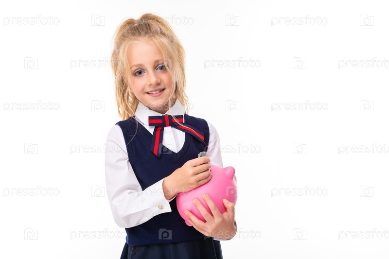 Изображение маленькой девочки со светлыми волосами держит розовую копилку свиньи и улыбается