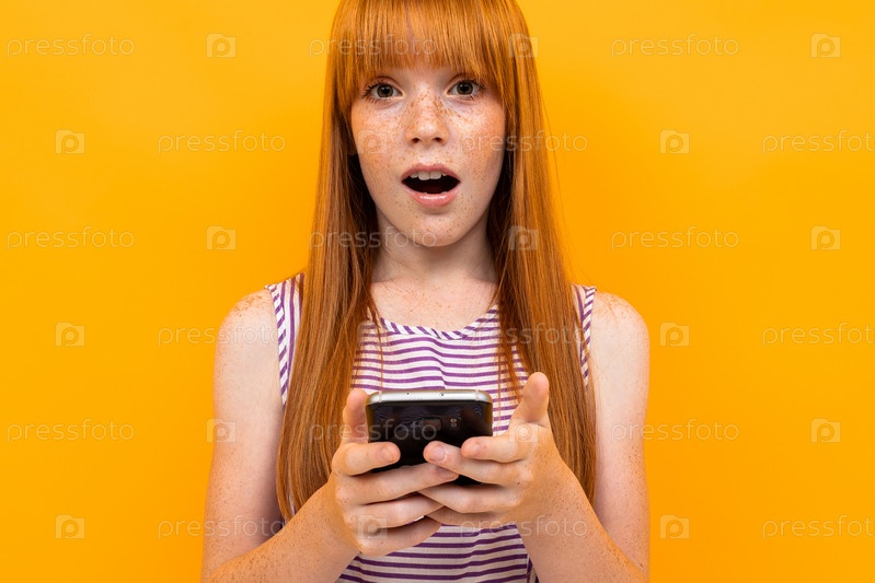 Удивленная рыжеволосая девушка держит телефон в руках на желтом фоне
