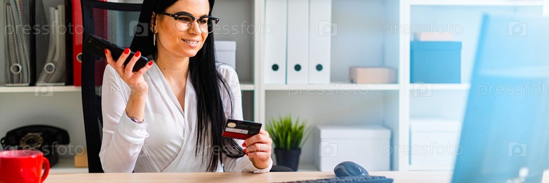 Молодая девушка сидит за столом, держа в руках банковскую карту и телефон