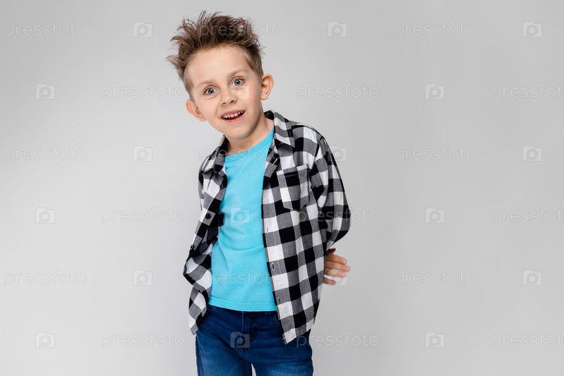 Красивый мальчик в клетчатой рубашке, синей рубашке и джинсах стоит на сером фоне. Мальчик скрестил руки за спиной