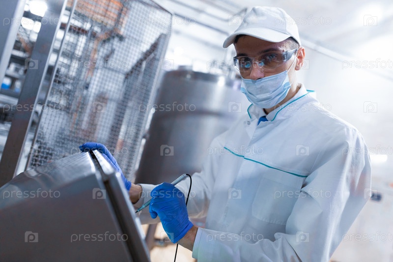 Мужчина в маске и халате работает с монитором на фабрике молочных продуктов