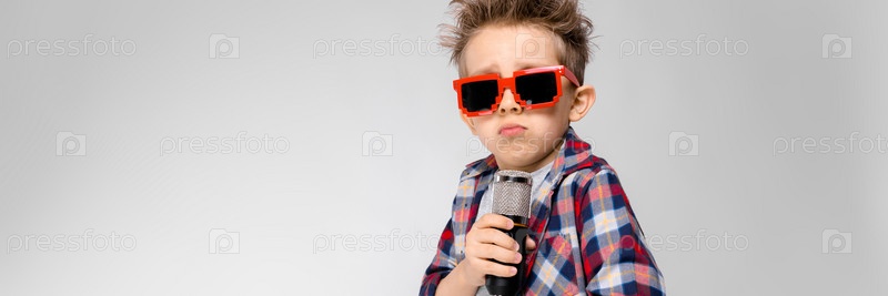 Красивый мальчик в клетчатой рубашке, серой рубашке и джинсах стоит на сером фоне. Мальчик в солнечных очках. Рыжий мальчик намотал проволоку на руку. Мальчик держит микрофон в руке