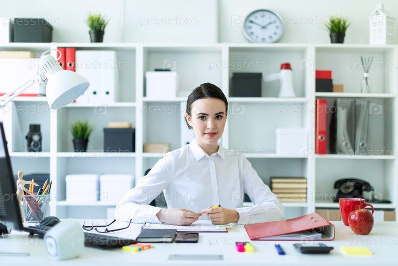 Молодая девушка в офисе сидит за столом и держит в руках ручку