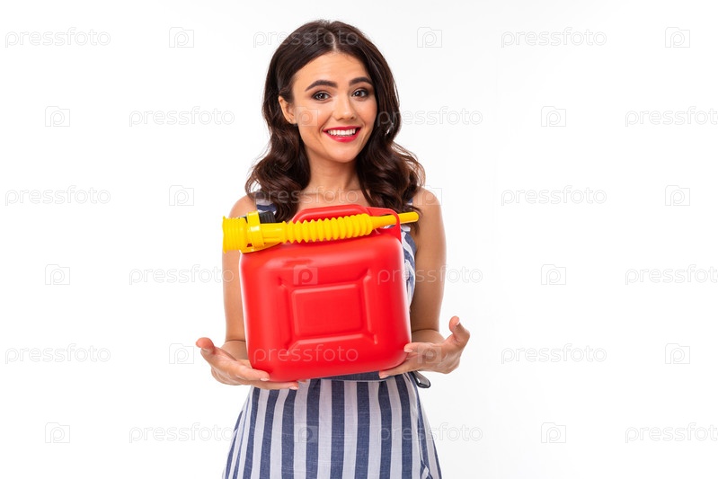 Молодая девушка с восхитительной улыбкой, ровными зубами, красной помадой, длинными волнистыми каштановыми волосами, красивым макияжем, в бело-голубом платье в полоску с декольте, очках в белой оправе держит в руках игрушечную красную банку