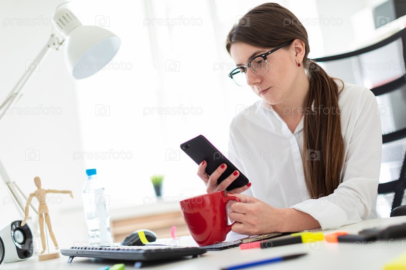 Очаровательная рыжеволосая девушка в очках и белой блузке работает в ярком офисе. фото с глубиной резкости