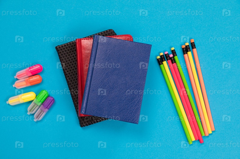 Красочные текстовые карандаши и мелки и три ежедневника в кожаных чехлах лежат на бледно-голубой изолированной поверхности
