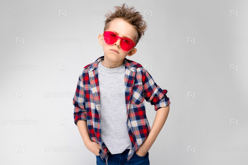 Красивый мальчик в клетчатой рубашке, серой рубашке и джинсах стоит на сером фоне. Мальчик в красных очках