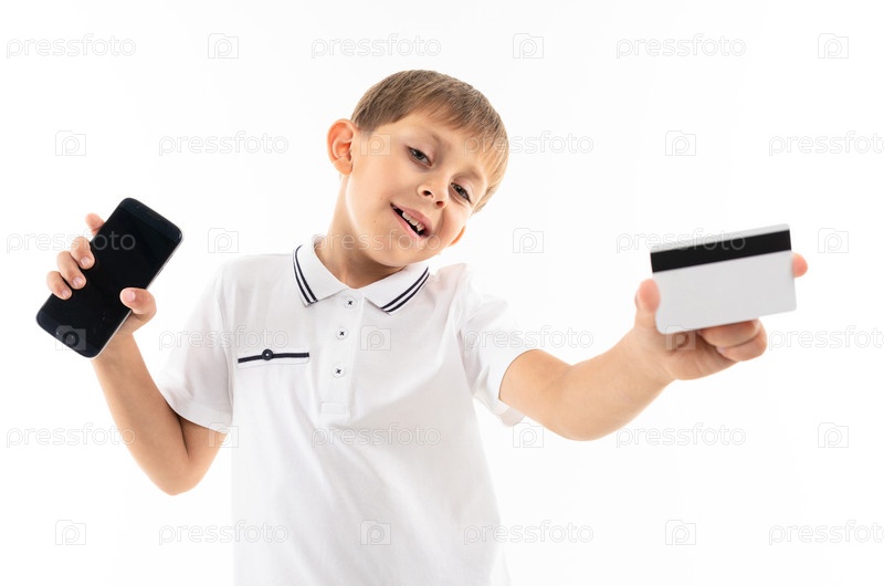Маленький мальчик в белой рубашке, синих шортах со светлыми волосами, черных очках с телефоном и картой улыбается