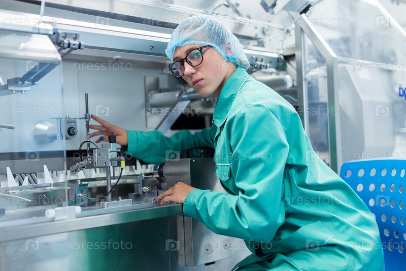 Рабочий управляет машиной на предприятии, чистая комната с s