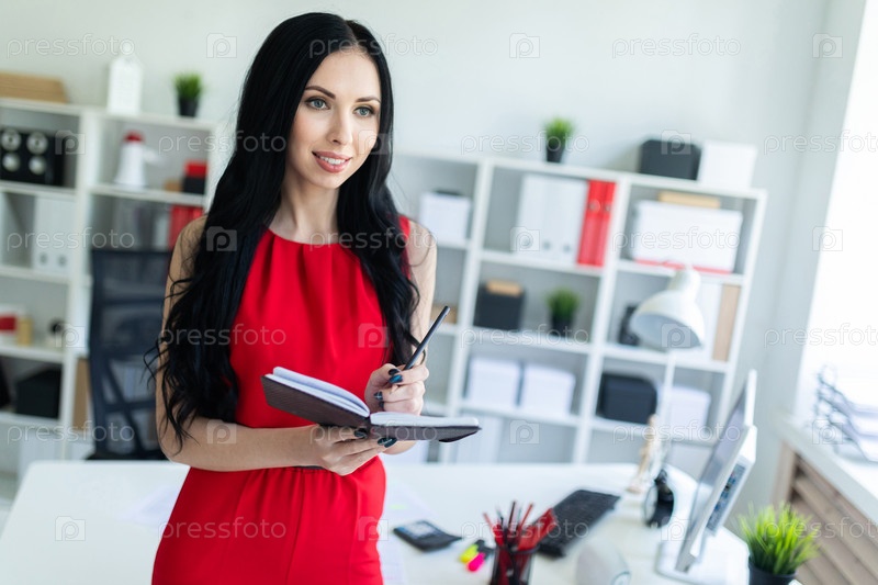 Красивая молодая девушка в красном костюме стоит в офисе и держит блокнот и карандаш