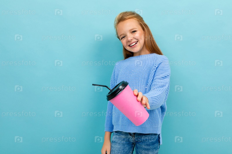 Красивая девушка-подросток протягивает стакан с напитком в руке на фоне синей стены