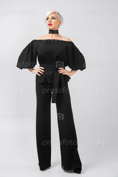 Молодая женщина с короткими светлыми волосами стоит прямо и смотрит в сторону изолированно на светлом фоне. Портрет великолепной блондинки в черном стильном костюме. концепция бизнеса и образа жизни