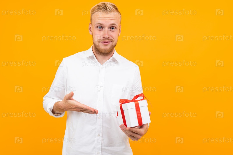 У парня есть подарок на желтом фоне