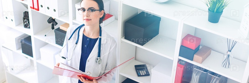Возле приюта стоит красивая молодая девушка в белом халате и листает красную папку с документами